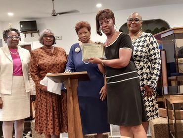 Photo 5. Sister Debra Bacy accepts award for Sister Vivian Session Wells, Mayfield Baptist Church
