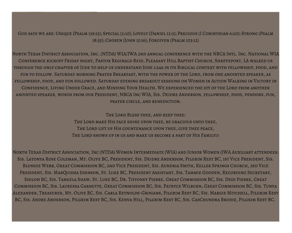 Pictured are members of the Missionary Baptist General Convention of Texas who participated in the annual Senior Women's Missionary Union, Unity of States Banner March during the National Baptist Convention of America International, Incorporated's annual session. NBCA International, Incorporated is led by President Samuel C. Tolbert, Jr, and the SWMU President is Dr. Barbara F. Wright. The Missionary Baptist General Convention of Texas is under the spiritual guidance of Rev. William T. Glynn, president. The Women's Ministry Director is Dr. Frances Worthey. The session was held September 11, 2023 through September 14, 2023. The host Church was the Antioch Fellowship Missionary Baptist Church in Dallas, where Rev. Chris Wesley is the pastor. This photo was taken after the Thursday afternoon session on September 14, 2023 concluded. Listed below are members of North Texas District Association, where Rev. Lloyd Hall III is the Moderator: