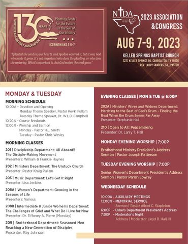 Opening Session – setting the stage: NTDA Dean of Congress, Pastor, Vincent Parker, Golden Gate Missionary Baptist Church, Dallas, TX with praise and worship. Opening Speaker: Assistant Dean of Congress, Pastor, Dr. Larry Hall, Mayfield Missionary Baptist Church, Fort Worth, TX. Small group breakouts (Pastors/Preachers, Preachers Kids (PK’s): Sis. Libbie Lee, Golden Gate Missionary Baptist Church, Dallas, TX. Moderator for Panel – Body, Soul, Spirit, Essentials to Health, and longevity healing from the inside out: Assistant Dean of Congress, Pastor, Dr. Michael Oyedokun, Love Community Missionary Baptist Church, Forney, TX with panelist Dean Vincent Parker and Dr. Krystal B. Caldwell, owner, Nervana Holistic Health